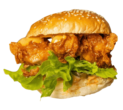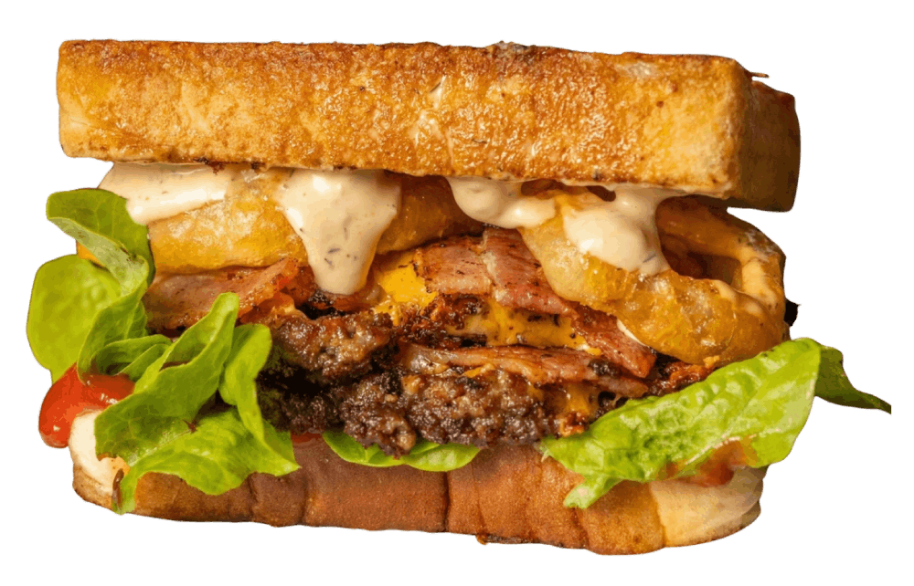 Two beef patties, double cheese, double bacon, lettuce, diced onion and onion rings! Then put some pickle mayo & ketchup on some cheezy toast buns!