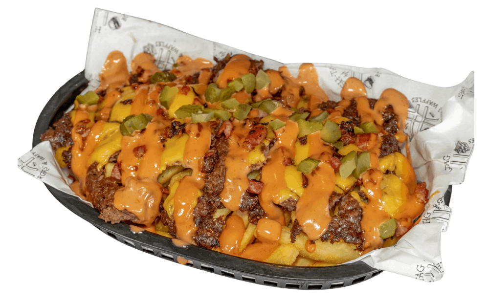 Crispy chips loaded with two smash patties (with cheese and onion of course), and smother in our Special Sauce, then top with dill pickles and crispy bacon!