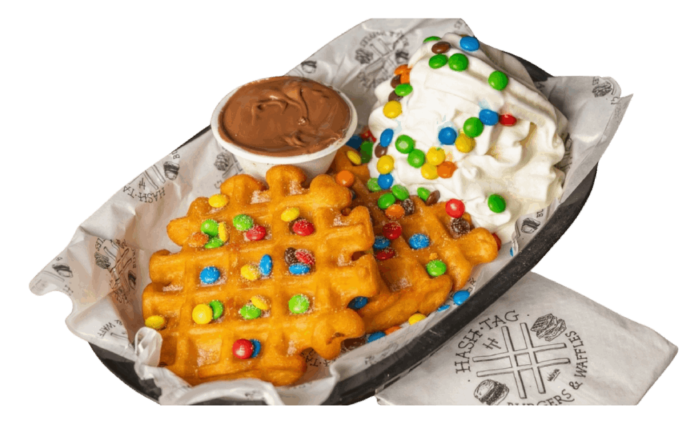 Two Deep fried waffles dusted with cinnamon sugar! Then loaded up with Ice cream, Nutella and M&M’s. Make your waffles weird… $5 extra. Replace the Nutella and M&M’s with fried chicken and maple!